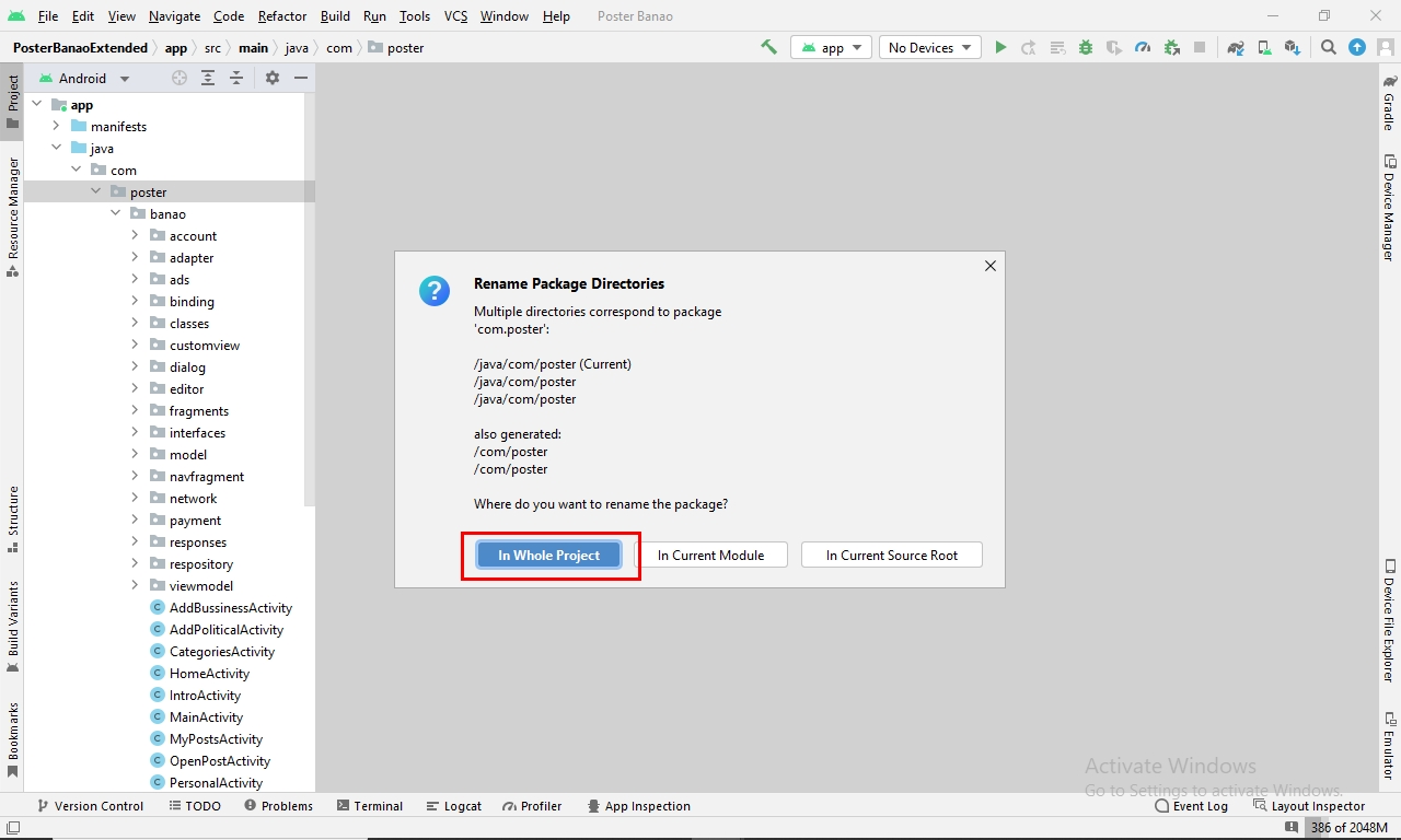 Note: When renaming com in Android Studio, it might give a warning. In such case, select Rename All.