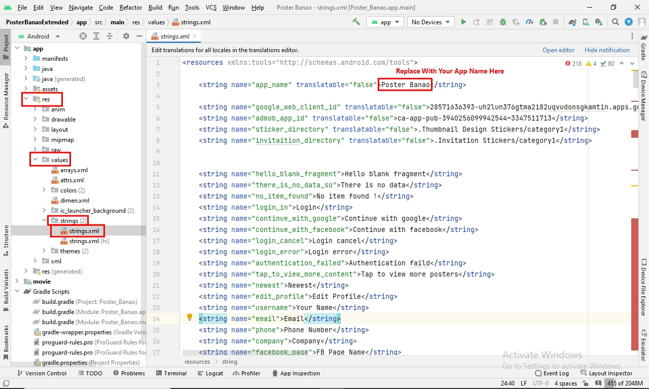 - Open Android Studio >Festival Poster Maker > res > values > strings.xml