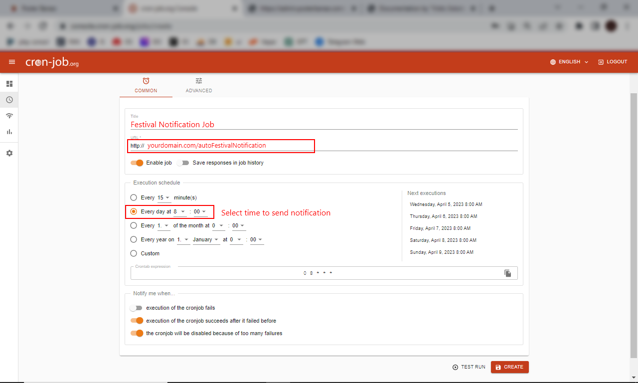 - Change yourdomain.com to your Domain https://yourdomain.com/API_KEY/autoFestivalNotification