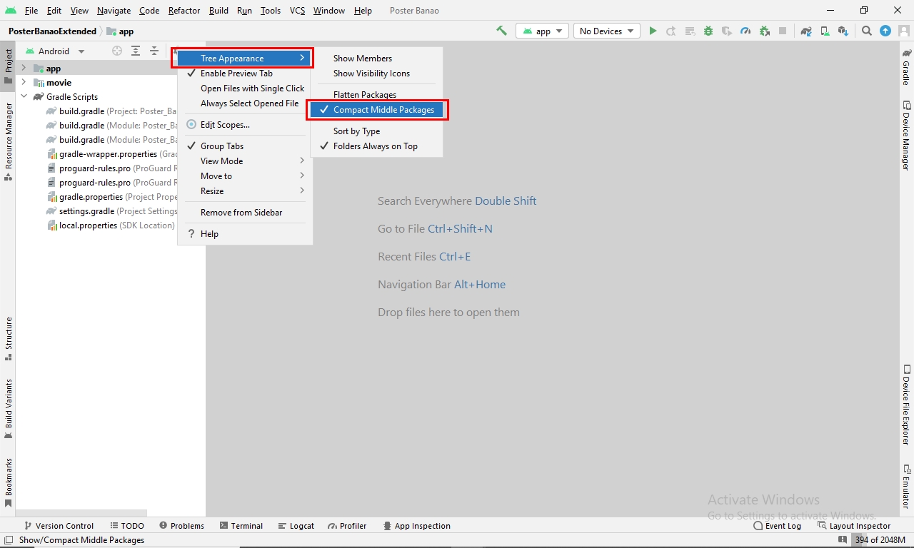 - In the Project pane, click on the little gear icon.Uncheck/Deselect the Compact Empty Middle Packages option.