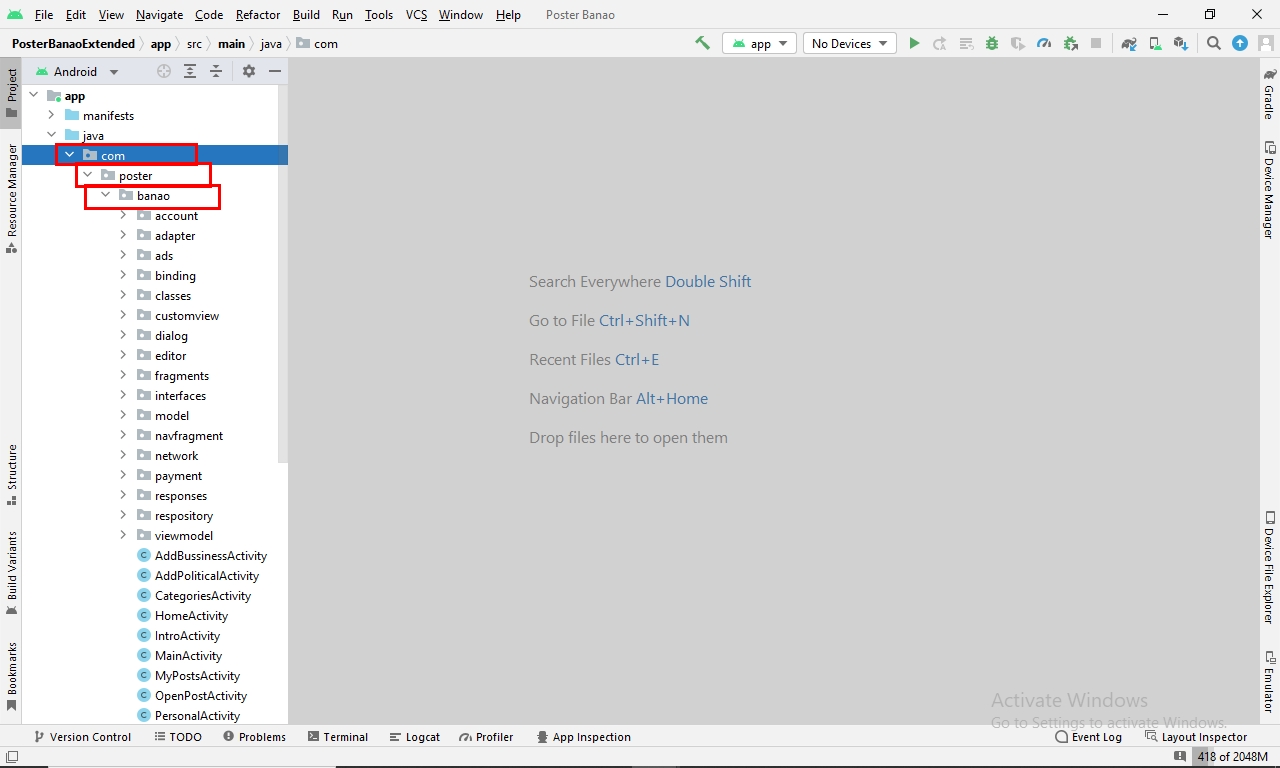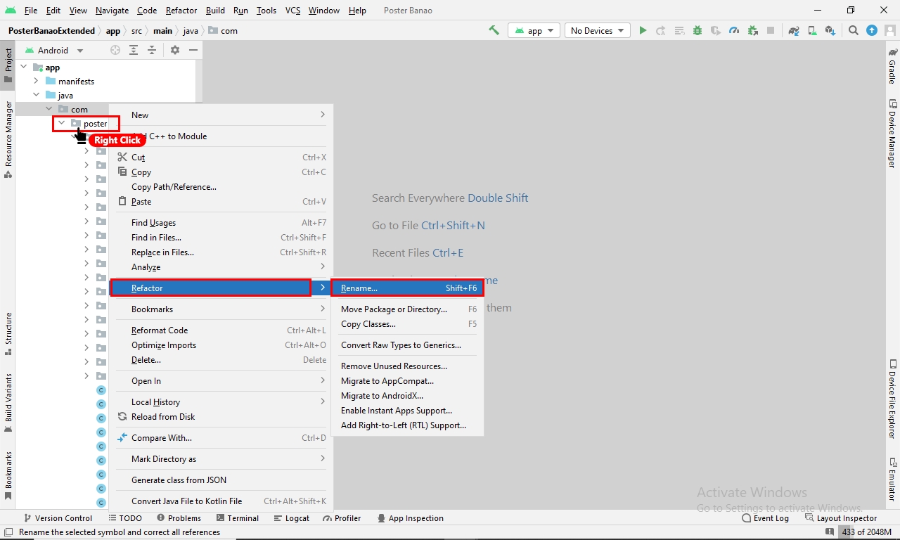 Note: When renaming com in Android Studio, it might give a warning. In such case, select Rename All.