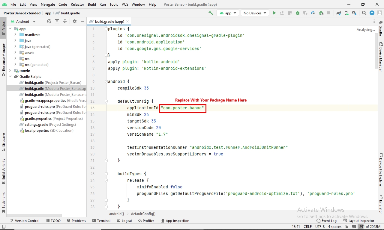 - Now open your build.gradle (Usually 'app' or 'mobile'). Update the applicationId to your Package Name and Sync Gradle, if it hasn't already been updated automatically.
